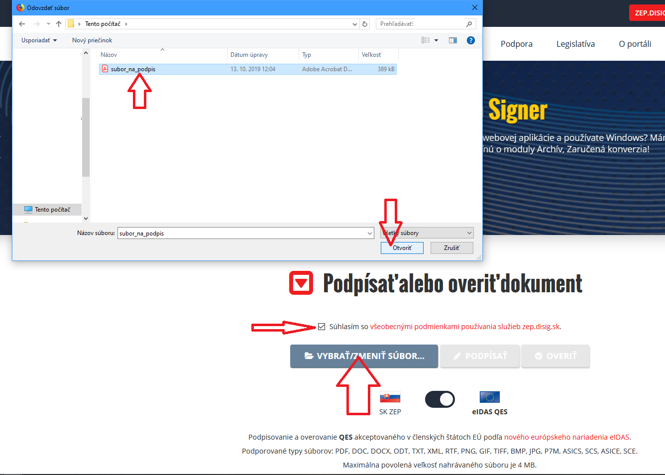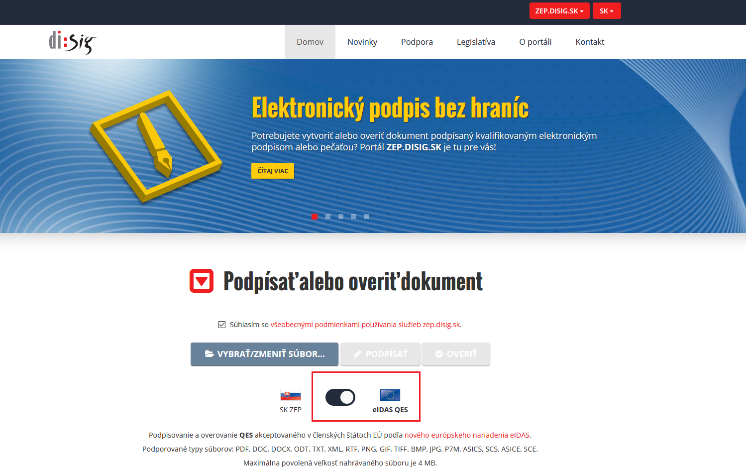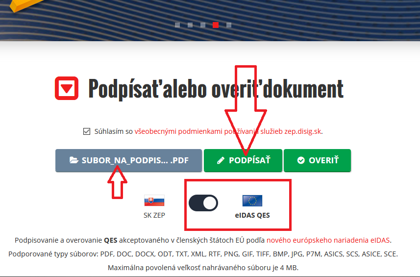 Uistite sa, že tlačidlo spôsobu podpisu je v polohe "eIDAS QAS", zaškrtnite súhlas s podmienkami používania a kliknite na tlačidlo vybrať súbor.