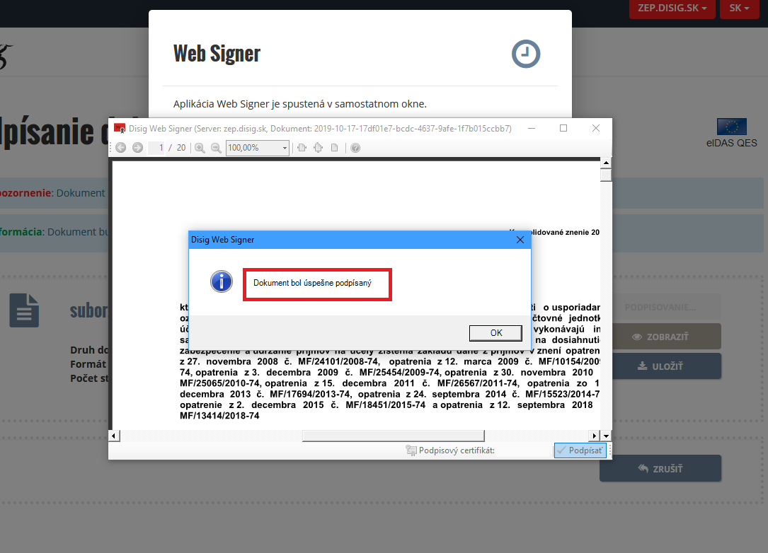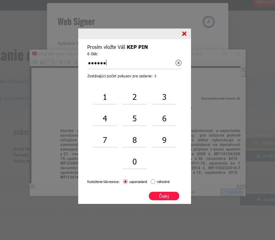 Následne vás vyskakovanie okno vyzve na zadanie KEP PIN, pozor, okno je rovnaké ako pred niekoľkými krokmi, no tentokrát vyžaduje zadanie KEP PIN, nie vášho BOK. Občania si častokrát nastavia oba kódy rovnaké, ale nie je to podmienka, preto sa uistite, že vkladáte správny kód, nakoľko sú len 3 pokusy. Po úspešnom zadaní KEP PINu by ste mali vidieť oznamovanie okno, že bol dokument úspešne podpísaný, ktoré potvrdíte stlačením "OK" a vyskakovacie okná sa zatvoria a presmerujú vás na stránku kde pracujete už s podpísaným dokumentom.