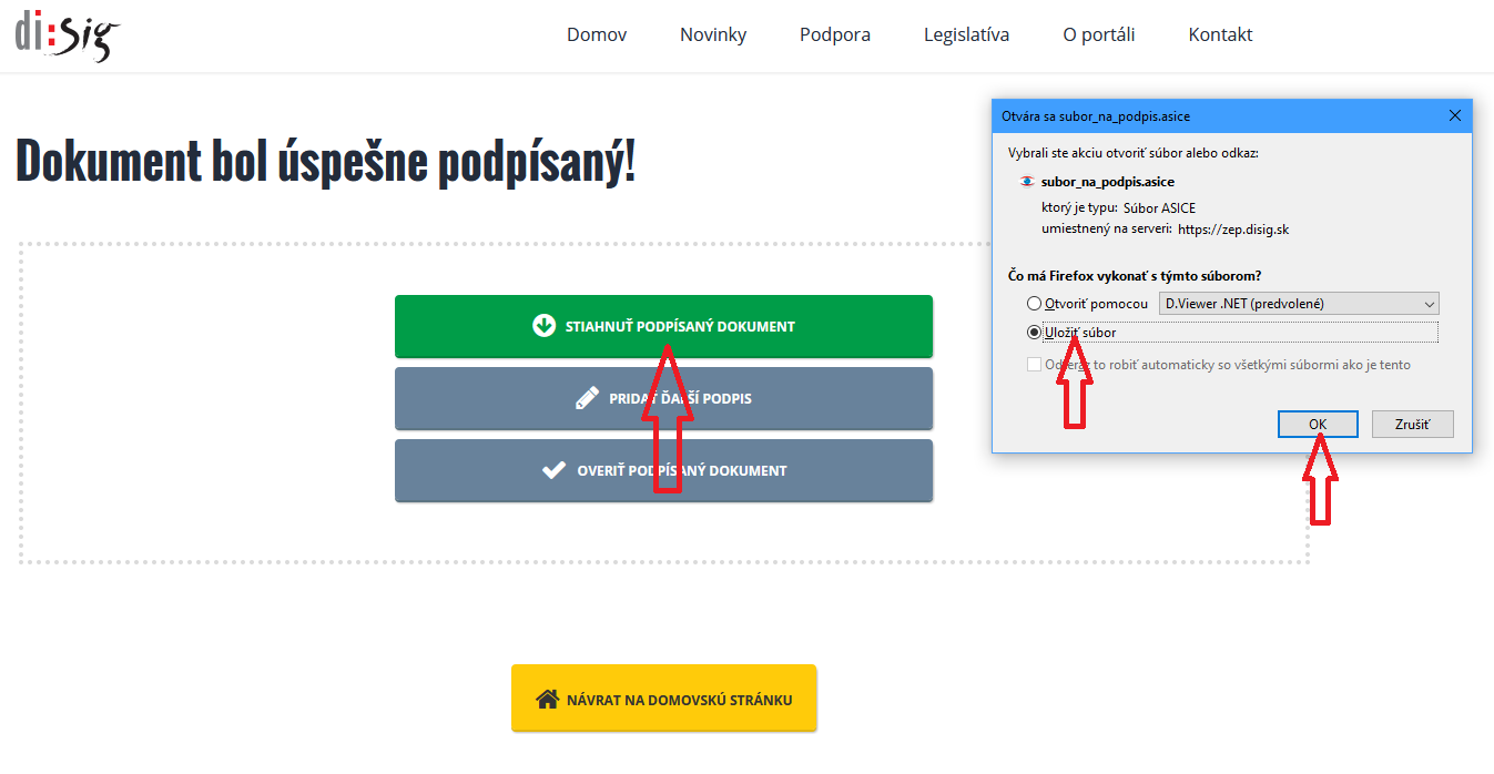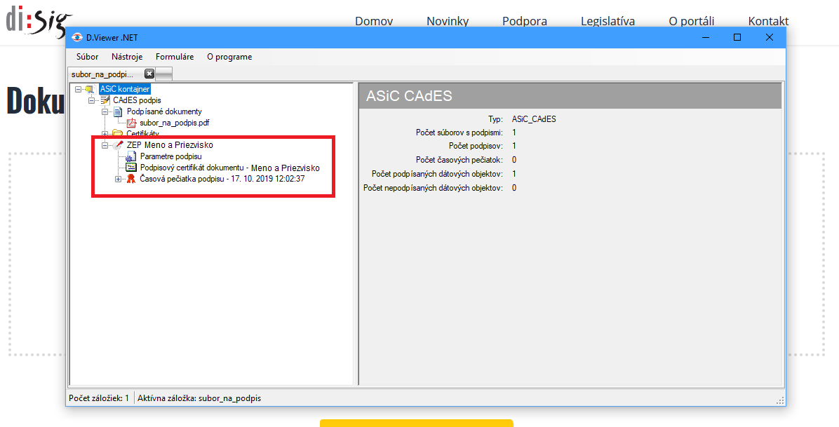 V prípade, ze ste dokument podpisovali vo formáte CAdES, teda viacerými podpismi, si nezabudnite predtým nainštalovať nástroj D.Viewer z portálu www.slovensko.sk, keďže podpísaný dokument bude vo formáte .ASIC, .ASICE, alebo inom formáte, ktorý bežné aplikácie nedokážu čítať. Štruktúra dokumentu otvoreného v D.Vieweri je uvedená na obrázku na konci stránky - kontajner "Podpísané dokumenty" obsahuje podpísaný súbor a pod ním sú uvedené mená a podpisy s časovými pečiatkami všetkých osôb, ktoré dokument podpísali.
