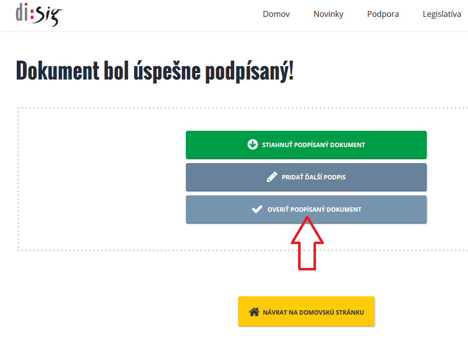 Podpísaný dokument si viete stiahnuť do svojho počítača, pridať ďalší podpis, alebo overiť, že je súbor naozaj správne podpísaný. Odporúčame v tejto časti stiahnuť dokument a uložiť do počítača a následne cez tlačidlo "OVERIŤ PODPÍSANÝ DOKUMENT" si skontrolovať jeho korektnosť. Ak však chcete dokument podpísať viacerými osobami, treba kliknúť na tlačidlo "PRIDAŤ ĎALŠÍ PODPIS", vytiahnuť občiansky preukaz z čítačky a vložiť ďalší občiansky preukaz a opakovať pre každý podpis kroky 4 až 7.