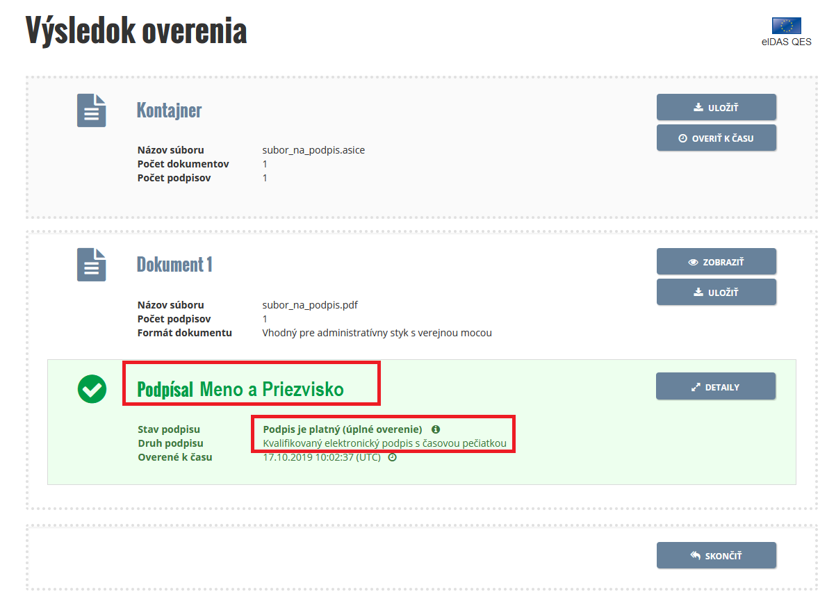 V časti overenia podpisu by ste mali vidieť zelený raámček, v ktorom je uvedené kto dokument podpísal a zároveň overenie jeho pravosti. V prípade úplného overenia a uvedenia, že sa jedná o kvalifikovaný elektronický podpis s časobou pečiatkou si môžete byť 100% istí, že podpis je pravý a je rovnocenný s úradne osvedčeným vlastnoručným podpisom.