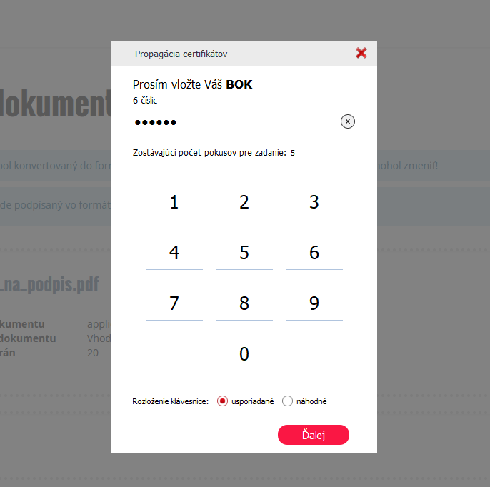Vložte váš občiansky preukaz do čítačky čipových kariet. Vyskakovacie okno vás vyzve na zadanie kódu BOK (ten, ktorý sa používa aj na prihlasovanie na www.slovensko.sk!). Po úspešnom zadaní a stlačení tlačidla "Ďalej" sa dostatnete na samotnú podpisovaciu stránku. Mali by ste vidieť názov svojho súboru a v položke formát dokumentu text "Vhodný pre administratívny styk s verejnou mocou".