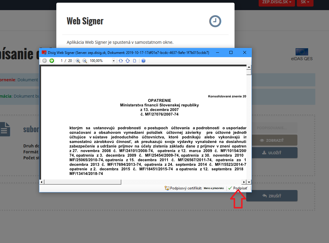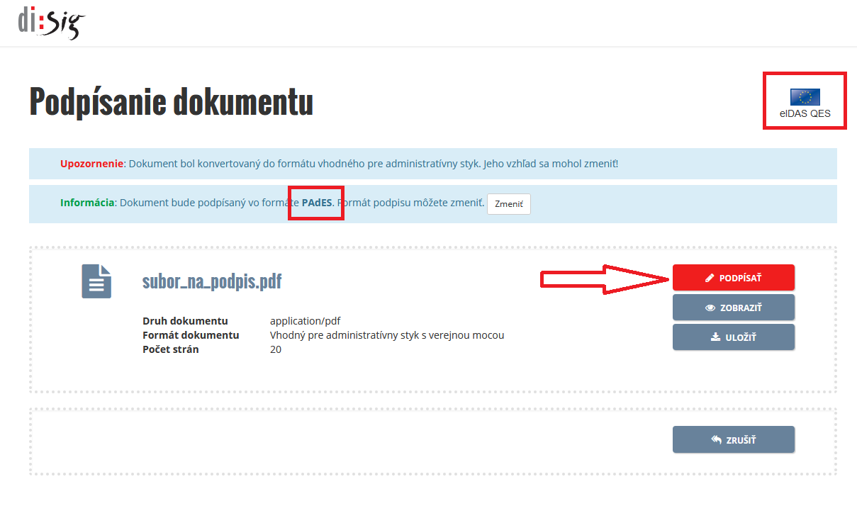 Po načítaní súboru jeho názov uvidíte v popise tlačidla na výber súboru. Ak ste sa zmýlili, opätovne kliknite na tlačidlo a vyberte správny súbor. Ešte raz sa uistite, že tlačidlo spôsobu podpisovania je v polohe "eIDAS QES" a následne stlačte tlačidlo "PODPÍSAŤ".