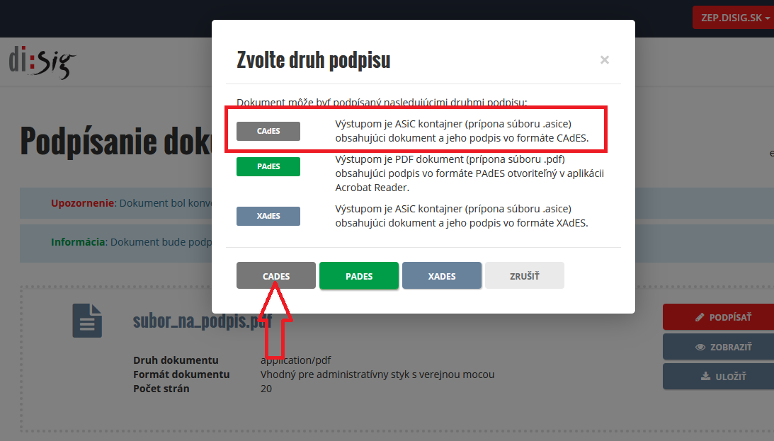 V prípade, že sa chystáte dokument podpisovať len jedným podpisom, je pre vás vhodný podpisový formát PAdES (len pre súbory PDF). Ak sa však bude súbor následne podpisovať aj ďalšími KEPmi, treba zmeniť nastavenie na položku CAdES, ktorá umožní vytvoriť štrukturovaný súbor, kde podpísaný originál súboru je v tzv. kontajneri a v pripojenom kontajneri sa nachádzajú všetky pripojené podpisy.
