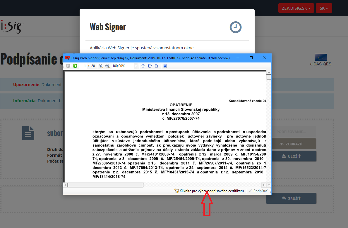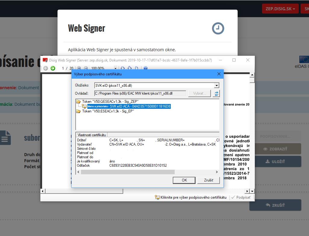 Po stlačení tlačidla "PODPÍSAŤ" sa spustí komponent Disig Web Signer (vyskočí okno s náhľadom súboru). V pravej dolnej časti okna je potrebné kliknúť na výber podpisového certifikátu. Jedná sa o certifikát nahratý na čipe vášho občianskeho preukazu, ktorý slúži na overenie totožnosti a vygenerovanie podpisu. Z možností vyberte certifikát, ktorý sa nachádza v záložke s textom "ZEP" prípadne "KEP" (pozor nie v záložke "EP"!) a stlačte OK. Po návrate do okna v popredí stlačte tlačidlo "Podpísať".